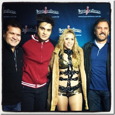 Luan Santana aproveitou o intervalo de tempo após o show realizado na noite de ontem em Minas Gerais para dar uma passadinha no camarim da banda Calypso, que também se apresentou na mesma noite. Ele foi acompanhado do empresário Luiz Augusto Nóbrega, presidente do Grupo Luan Promoções que está comemorando 10 anos em 2012. O encontro entre as duas gerações da música rendeu bastante papo e troca de ideias. Chimbinha não poupou elogios ao astro sertanejo, afirmando que Luan é humilde, muito profissional e deveria servir de exemplo para a juventude. O guitarrista da dupla paraense, inclusive, permaneceu no evento e acompanhou o show até o final, atendendo a um pedido do cantor.